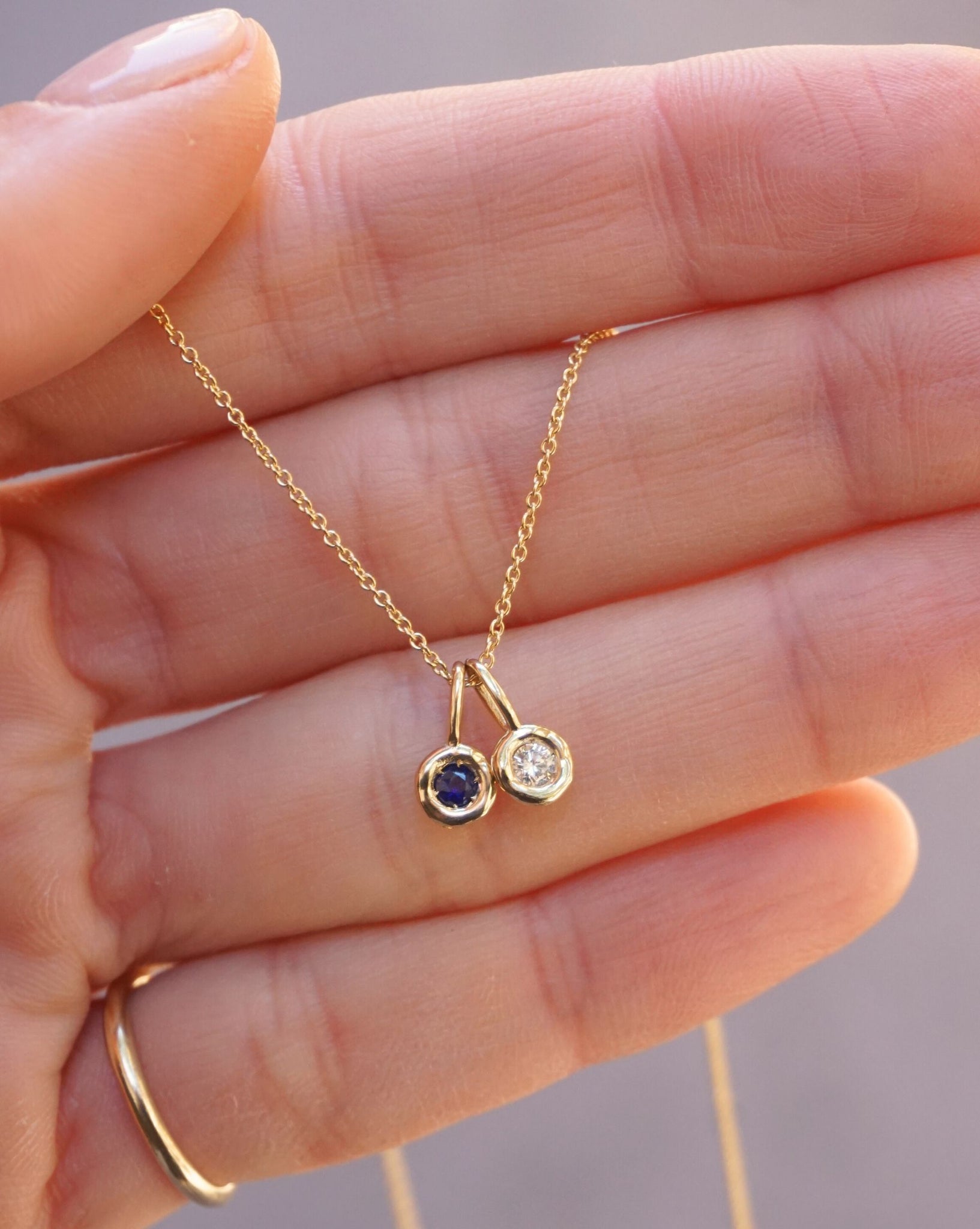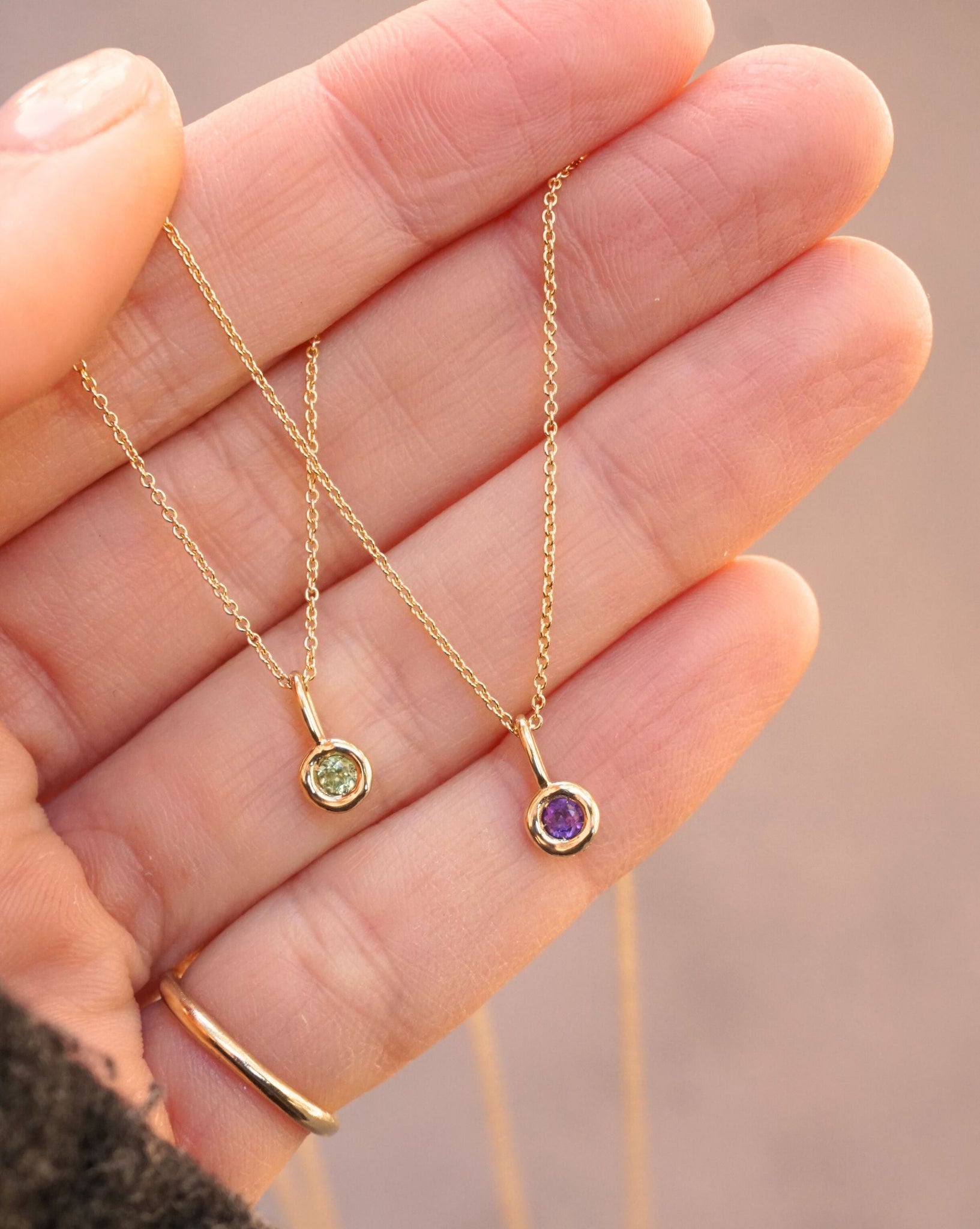 Pieza tipo charm realizada en oro de 9kt, acompañada de una gema natural asociada a cada mes de nacimiento y con cadena en el material que elijas.