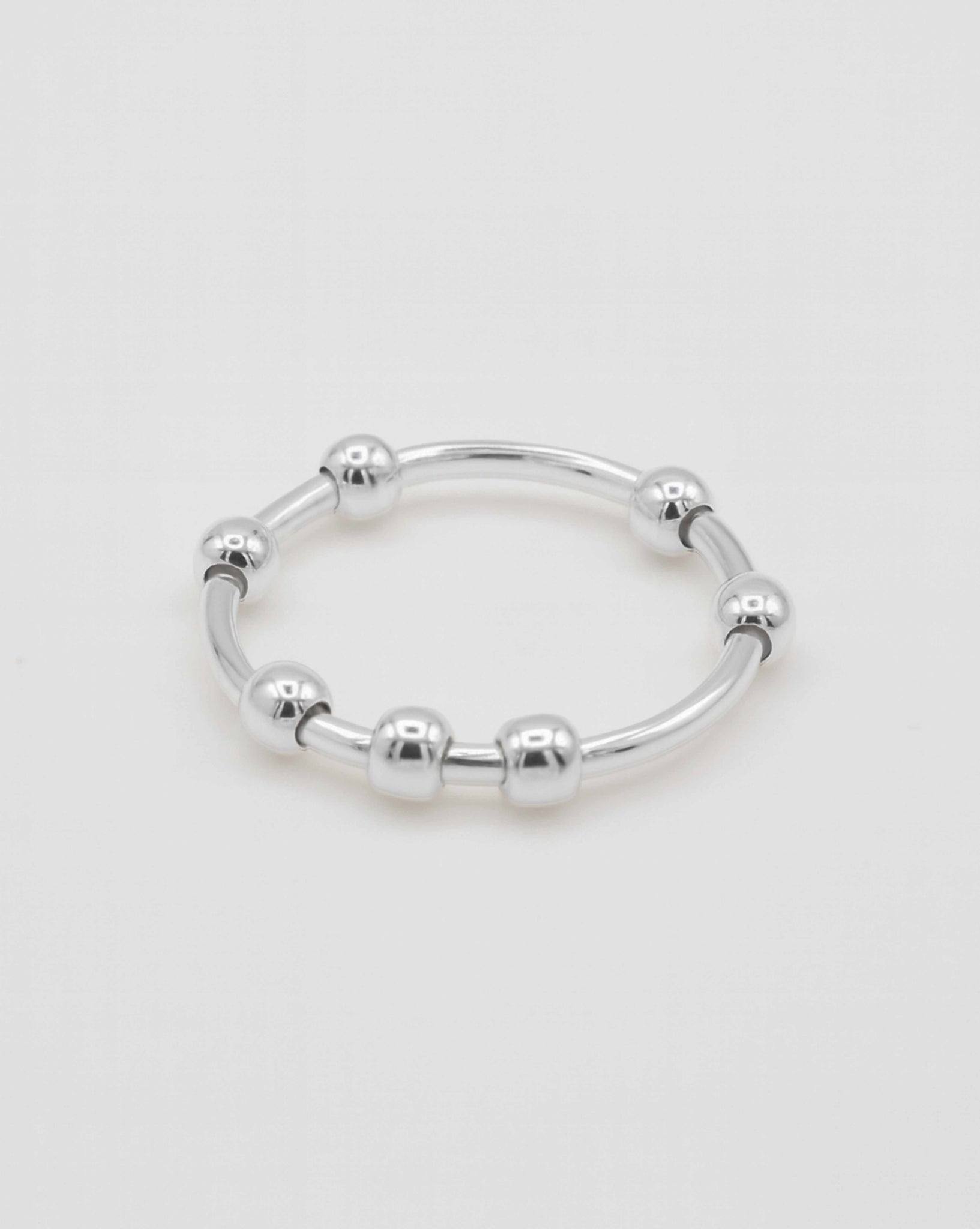 Anillo simple de plata de ley 925 de 1,3mm de grueso. Lleva 7 bolitas de 3mm cada una, que se mueven por todo el aro.