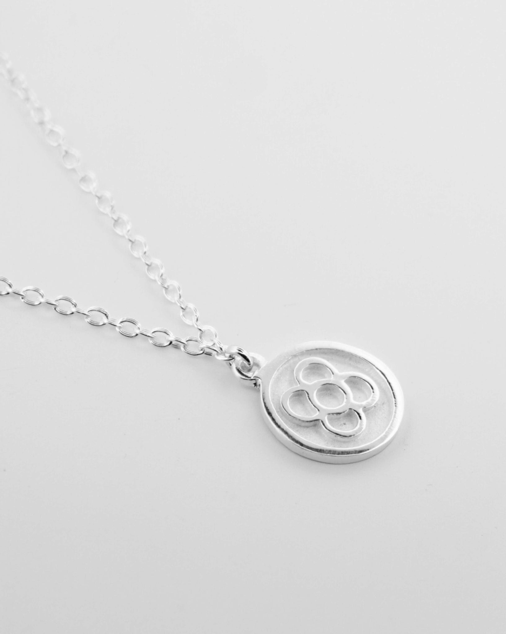 Medalla de plata de ley 925 hecha a mano con el típico dibujo de la flor modernista de las baldosas de Barcelona.